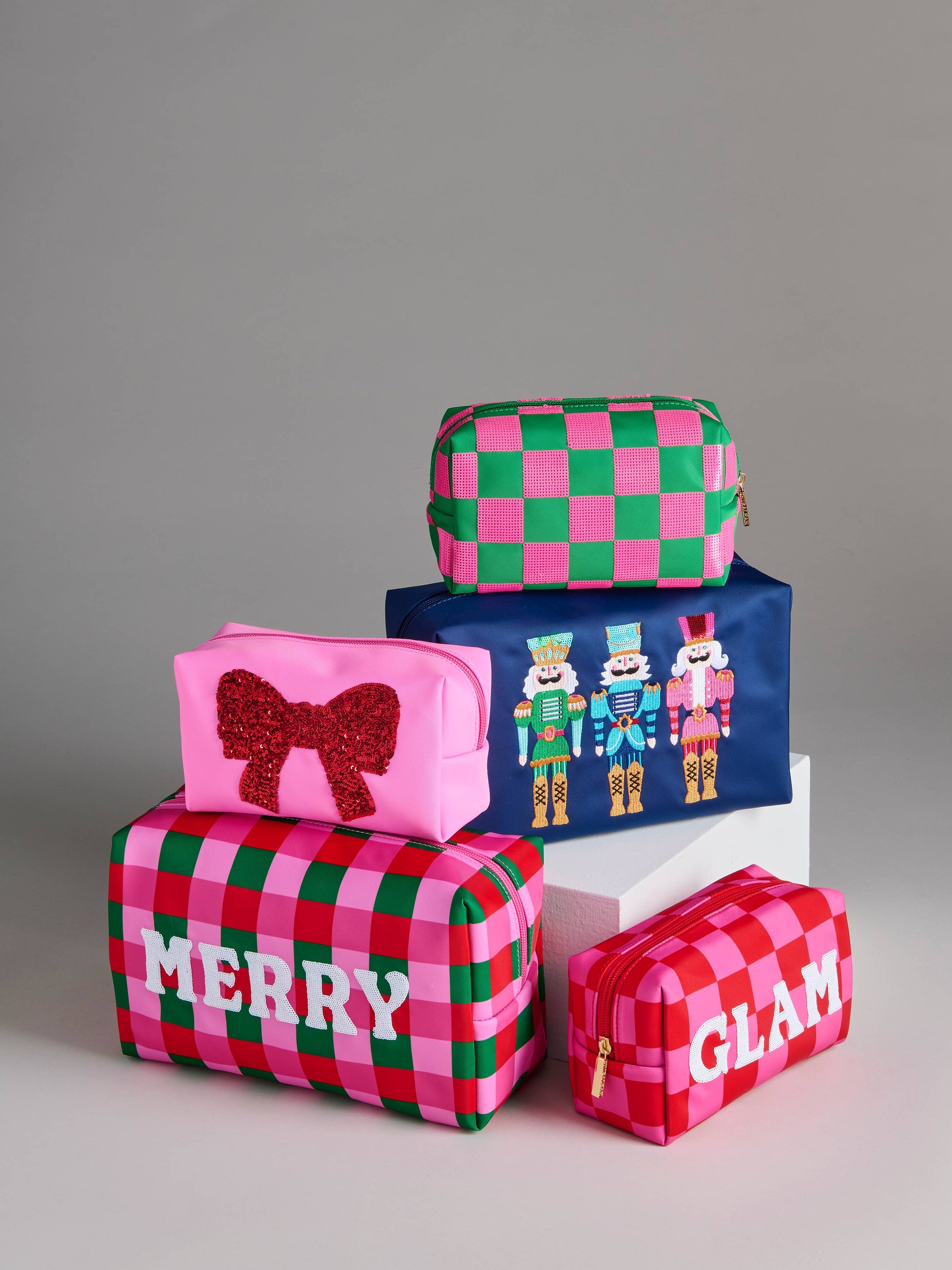 Measures L 7" x W 3" x H 4"Made from polyester and sequins, The Cara Check Pattern Zip Pouch is your new go-to for keeping things cute and contained. Featuring a bold green and pink checkerboard design with a dash of sparkle, this compact pouch brings serious personality to your purse or vanity. The zip-top closure keeps your must-haves secure, while the structured shape makes it easy to grab on the go. Perfect for stashing makeup, chargers, or whatever tiny treasures you carry.