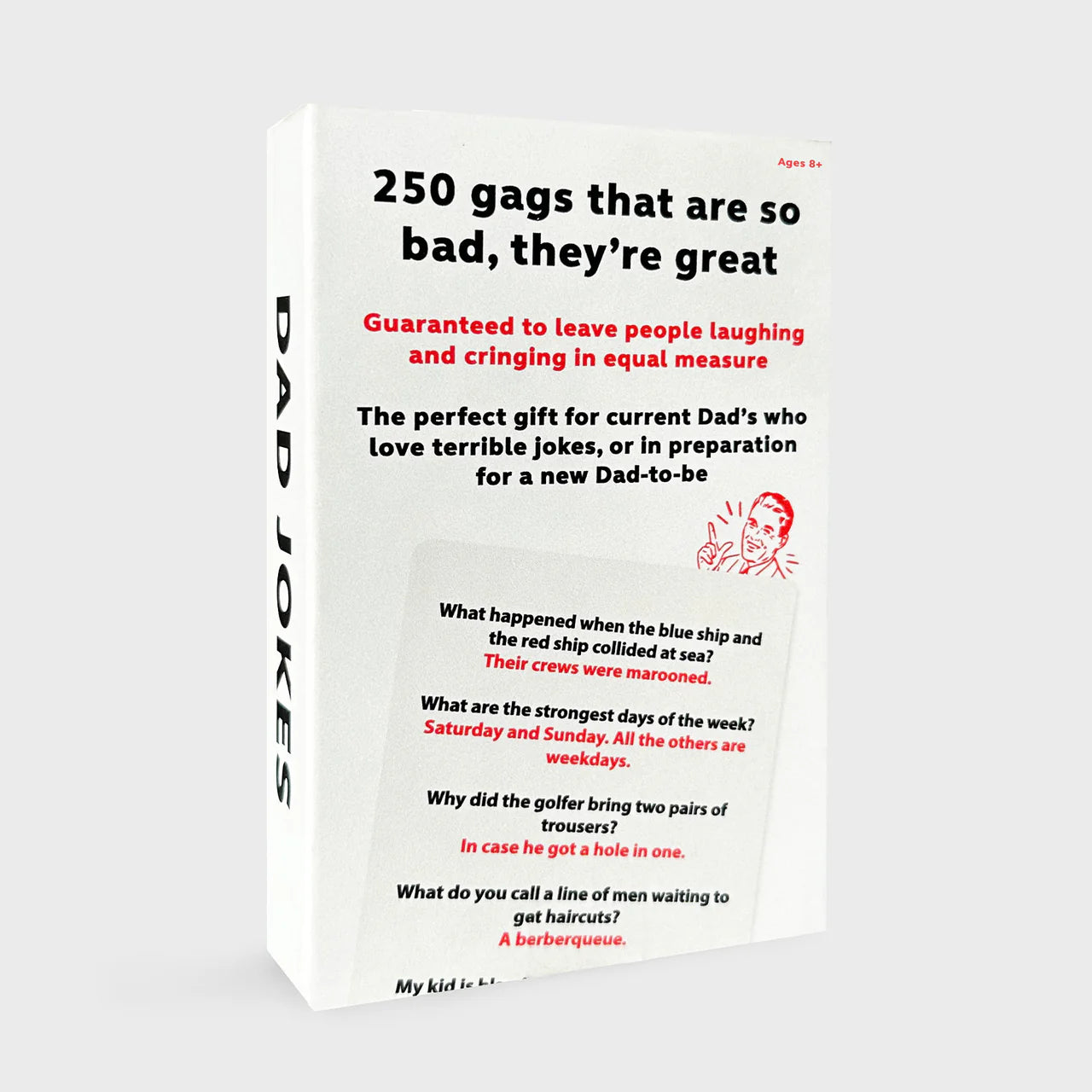 Now he can have them right at his fingertips with this deck of 250 cheesy gags, so bad you can’t help but laugh
