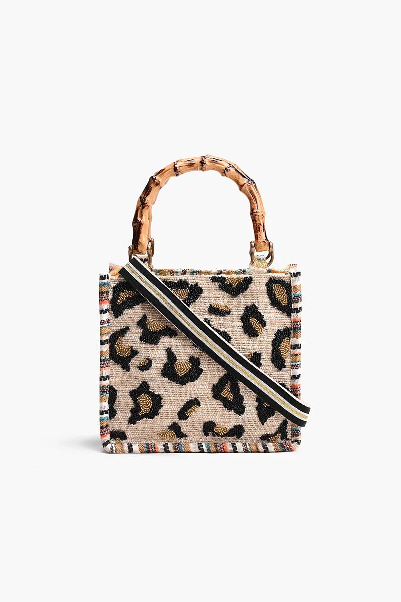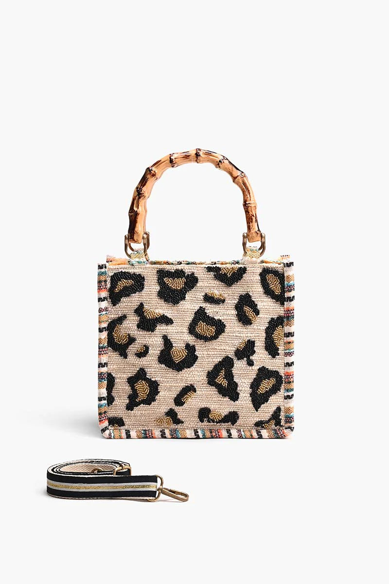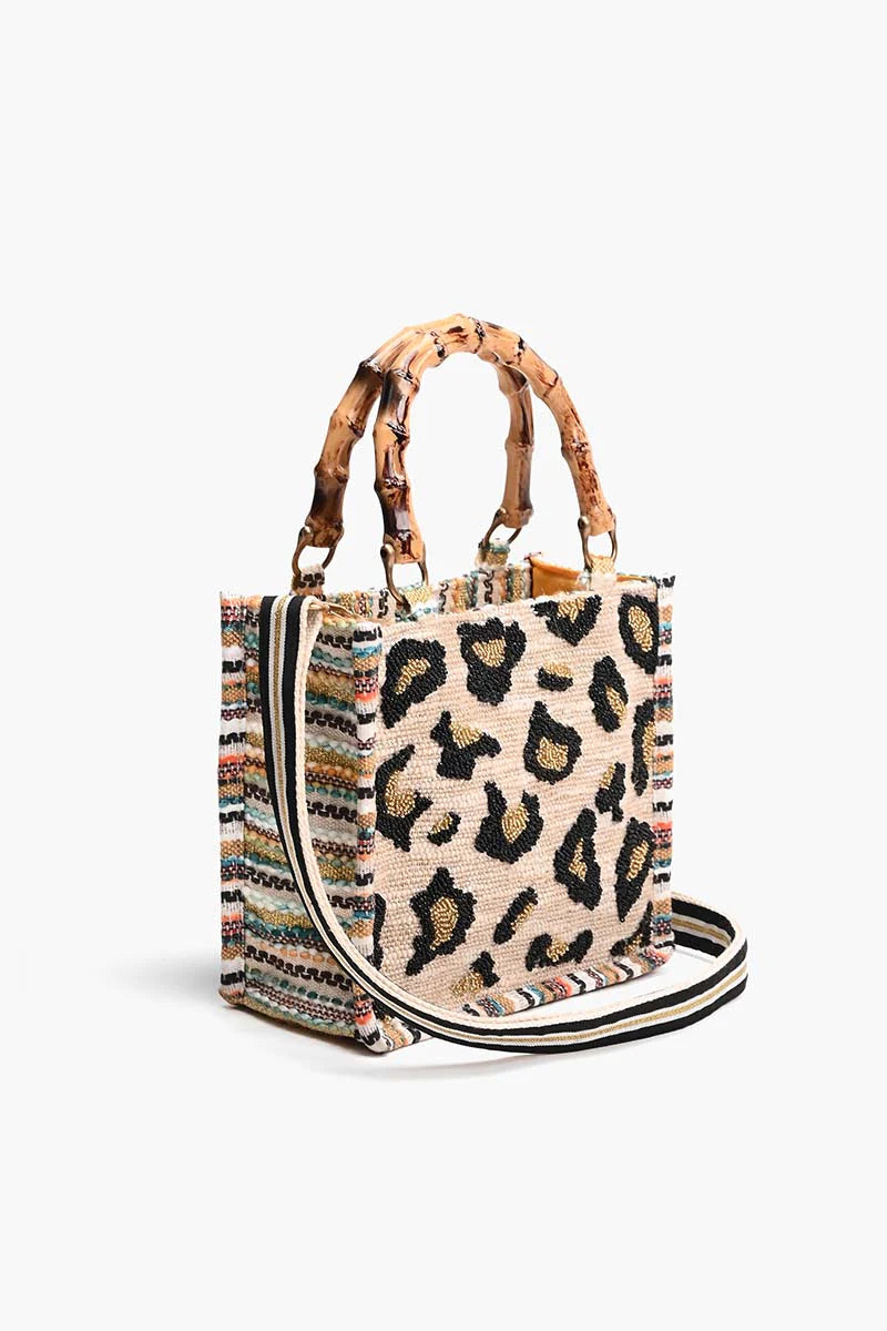 The Luxe Leopard Handbag is the perfect accessory for any fashionista. This stylish tote is crafted with a bamboo top handle, hand embellished beadwork in the front, and a leopard pattern. It also has a long adjustable strap, magnetic button closure, and is made with hand-woven jacquard fabric for added luxury. The lined interiors include a zip pocket and a mobile pocket for extra convenience.