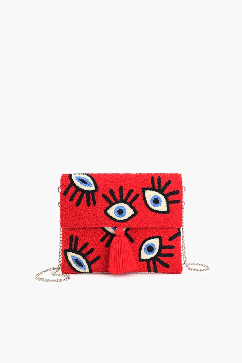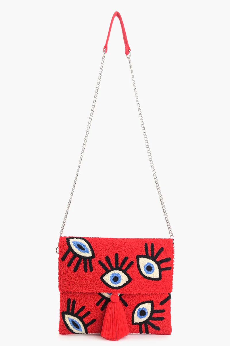 Turn every head in the room with the Ruby Whimsical Wonder Eye Clutch a playful, eye-catching flap clutch with tassel accents