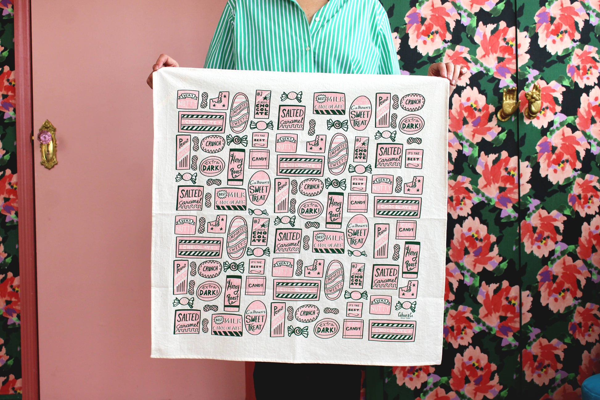 100% cotton tea towel. Aprox 28” X 28” screen printed with hanger loop on back.