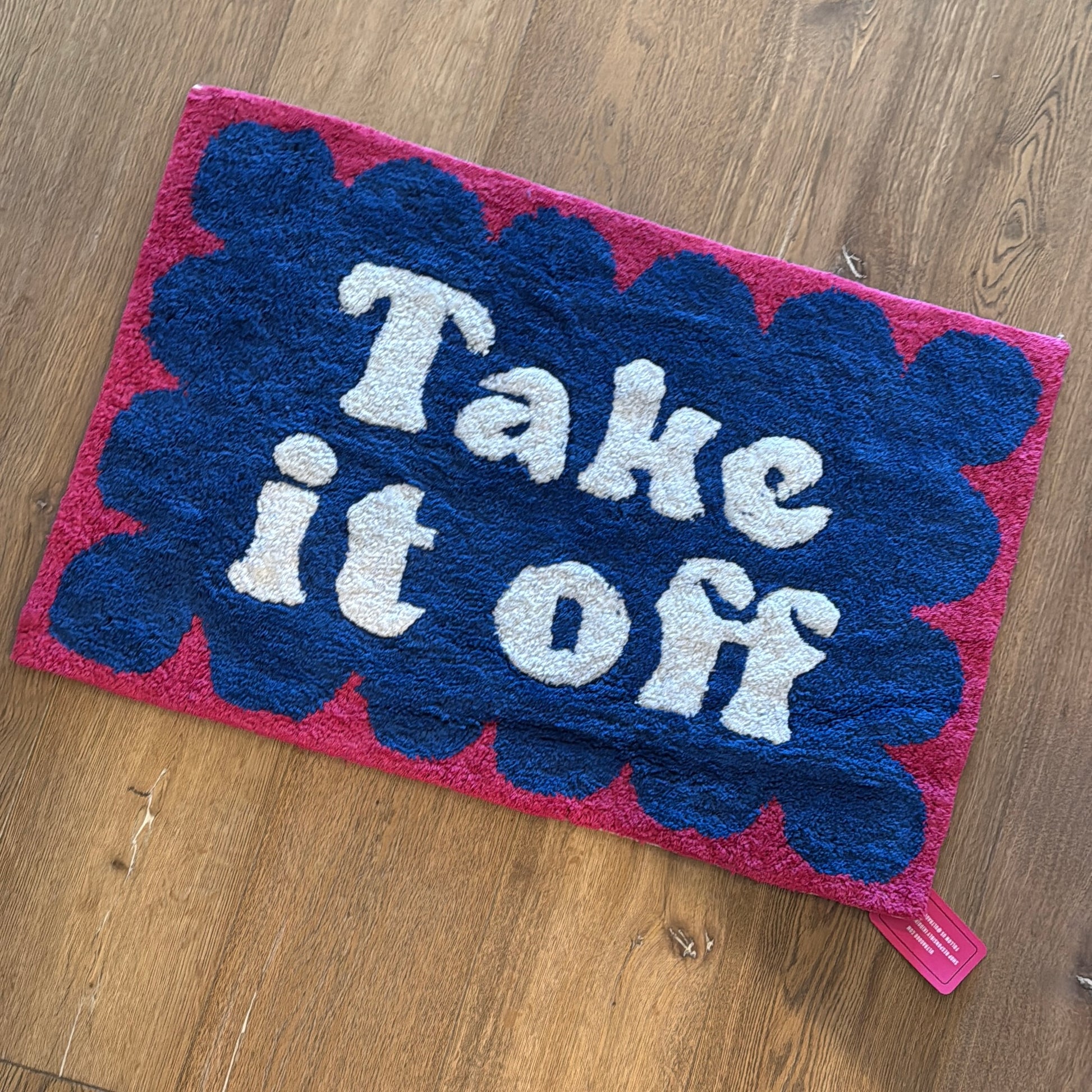 This high-quality, handmade bath mat does more than keep your toes warm—it talks back. With bold navy blue text on sunny yellow-and-white stripes, it delivers the naked truth right before your shower: Take it OFF. (Yes, even like that.)